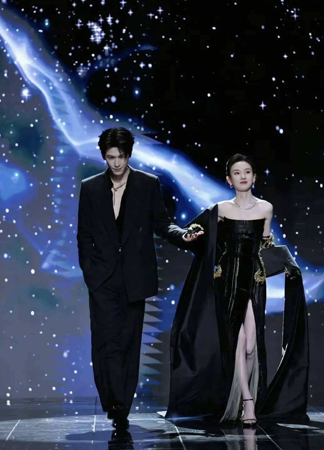 張凌赫はGUCCIのブラック高級仕立てを着用。シャープなシルエットが長身を際立たせ、落ち着いた気品を強調した。控えめなジュエリーとの組み合わせが全体を引き締め、冷静沈着な雰囲気をいっそう印象づけた。一方の宋祖儿はRobert Abi Naderのブラックドレスで登場。身体のラインを美しく描くデザインに、シンプルなダイヤモンドジュエリーを合わせ、華やかさと強さを兼ね備えた存在感を放った。