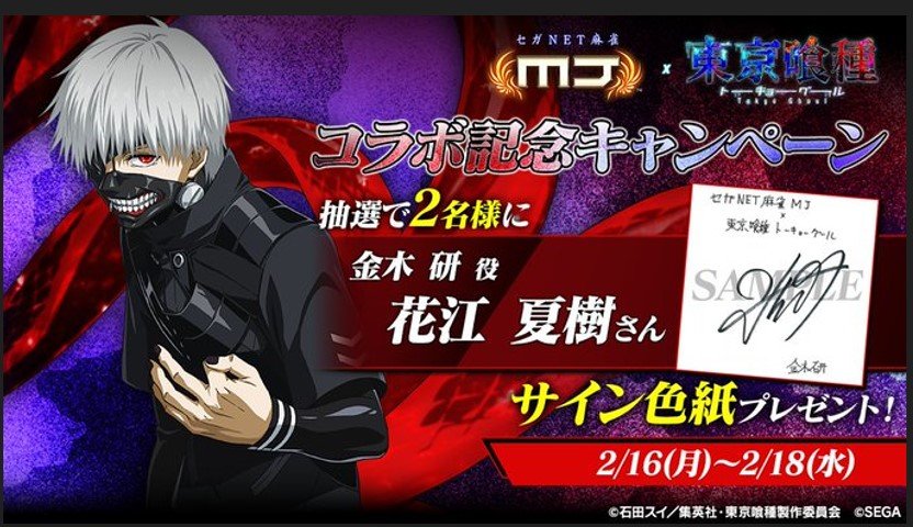 株式会社セガが展開するネットワーク対戦麻雀『セガNET麻雀 MJ』』にて、TVアニメ『東京喰種トーキョーグール』とのコラボイベント「東京喰種CUP」がスタートした。リアルな牌演出と緊張感ある対局が魅力のMJに、ダークファンタジーの世界観が融合するという、意外性のある組み合わせだ。