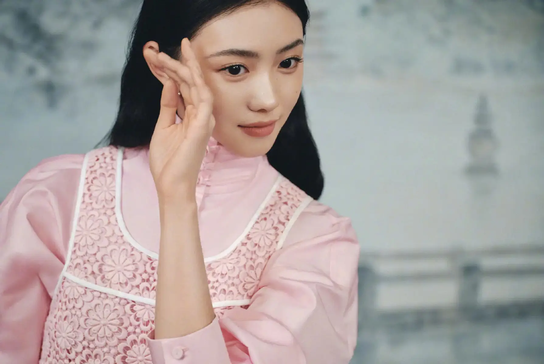 武術の動きを披露する場面では、無駄のない身のこなしと引き締まった表情で凛とした強さを表現した。一方、ピンクのレース旗袍をまとった姿では、しとやかで優美な印象を与え、まったく異なる魅力を見せている。巻物を軽く持ち上げるカットでは、東洋的な美意識を強調し、落ち着きのある佇まいが際立った。