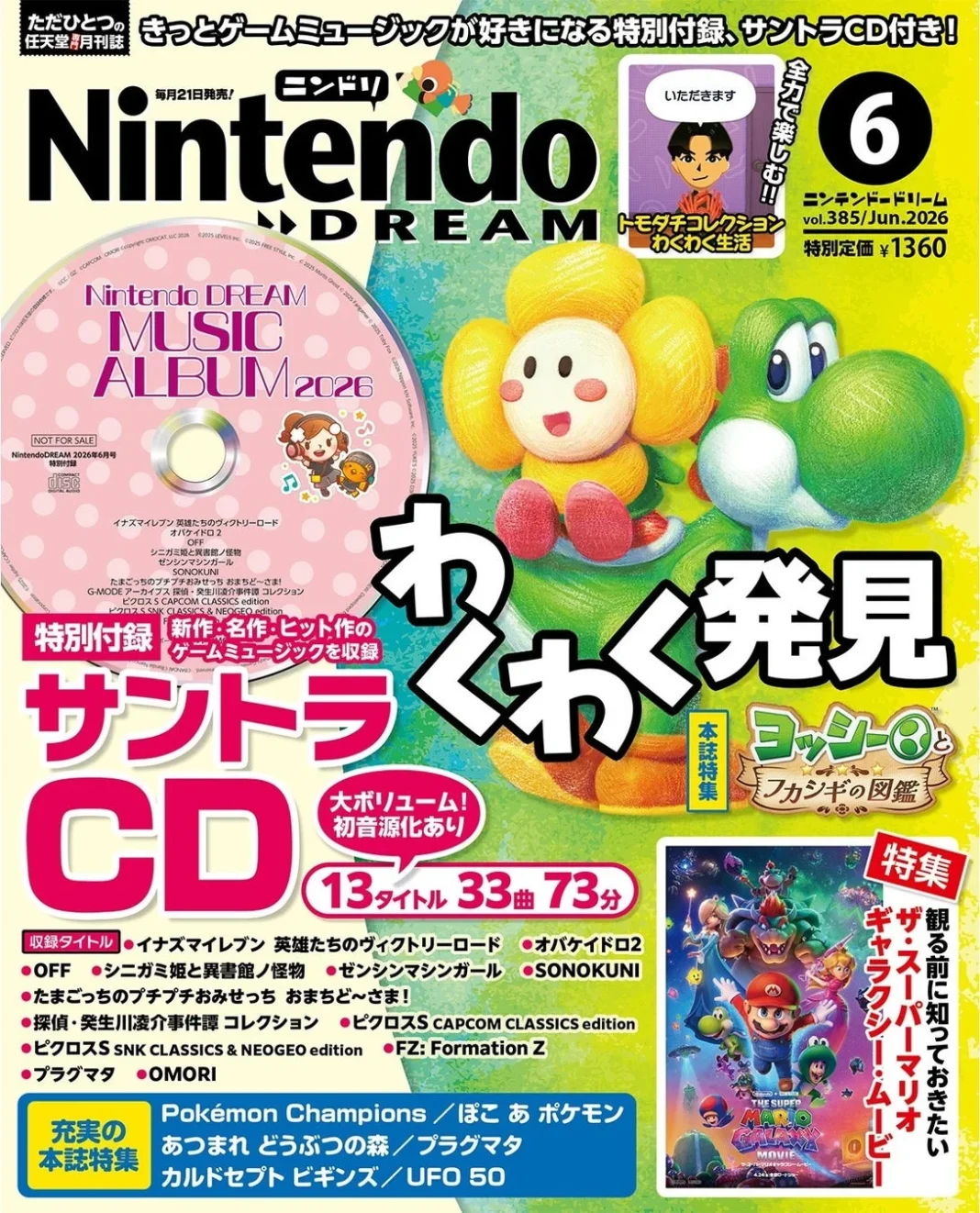 任天堂専門誌『ニンテンドードリーム』6月号が、2026年4月21日に発売される。最大の特徴は、ゲーム音楽を収録した付録CD「Nintendo DREAM MUSIC ALBUM 2026」の同梱だ。近年、デジタル配信が主流となる中で、物理メディアとしての価値を打ち出した構成となっている。